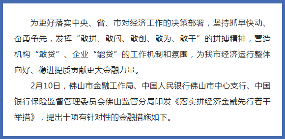 为更好落实中央、省、市对经济工作的决策部署,坚持抓早快动、奋勇争先,发挥“敢拼、敢闯、敢创、敢为、敢干”的拼搏精神,营造机构“敢贷”、企业“能贷”的工作机制和氛围,为我市经济运行整体向好、稳进提质贡献更大金融力量。 2月10日,佛山市金融工作局、中国人民银行佛山市中心支行、中国银行保险监督管理委员会佛山监管分局印发《落实拼经济金融先行若干举措》,提出十项有针对性的金融措施如下。...+阅读全文